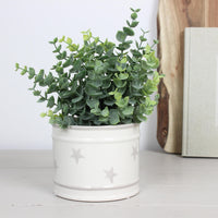A charmingly simple round ceramic pot with faded grey star decal around it.